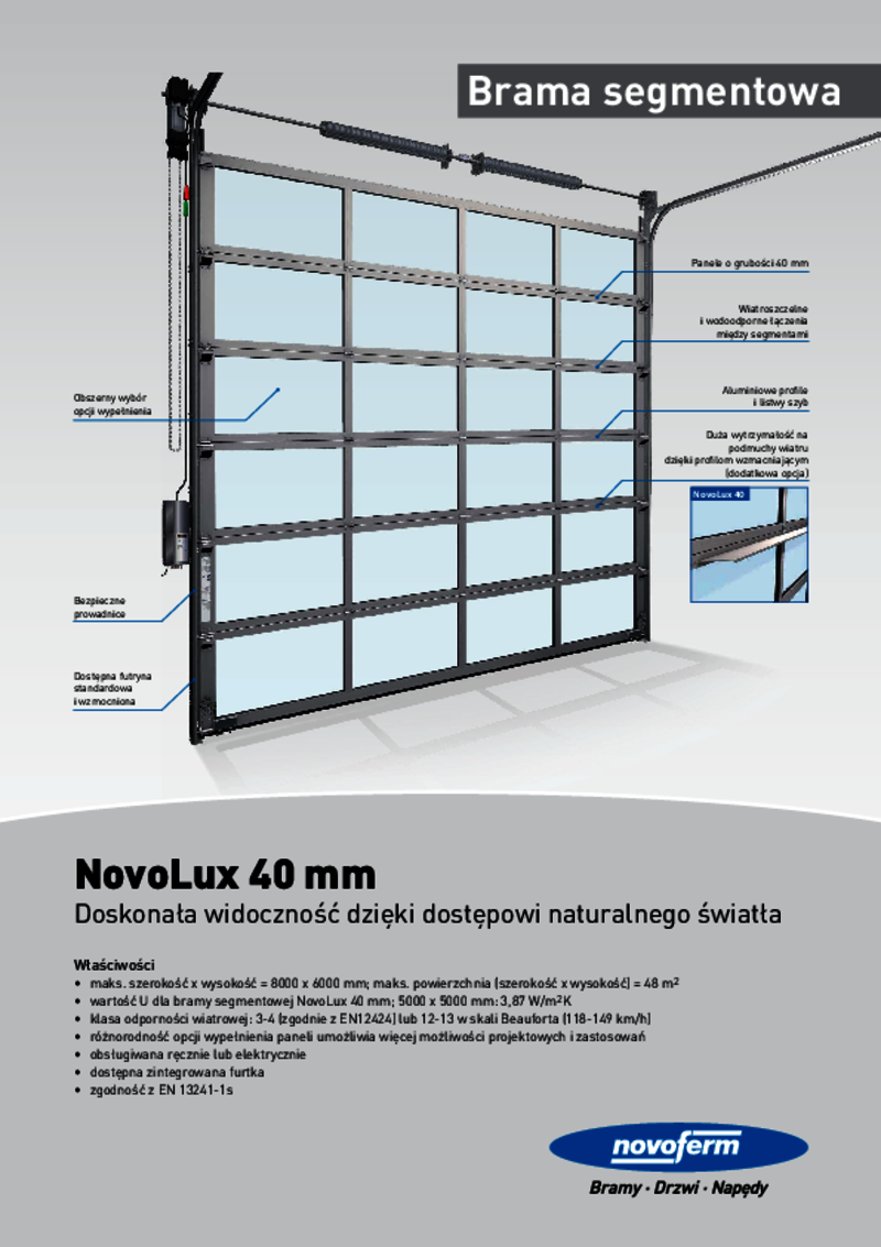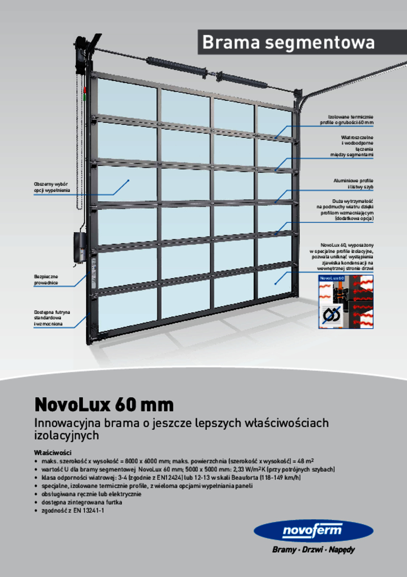 Brama segmentowa NovoLux 60 jest nowoczesna i innowacyjna, charakteryzuje się formą, funkcjonalnością i łatwością montażu. Brama o grubości 60 mm jest standardowo wyposażona w potrójne przeszklenie i gwarantuje doskonałe właściwości termoizolacyjne i dźwiękoszczelne oraz zapobiega kondensacji. Idealna w miejscach, w których ważne jest światło, widoczność i stały klimat wewnętrzny.