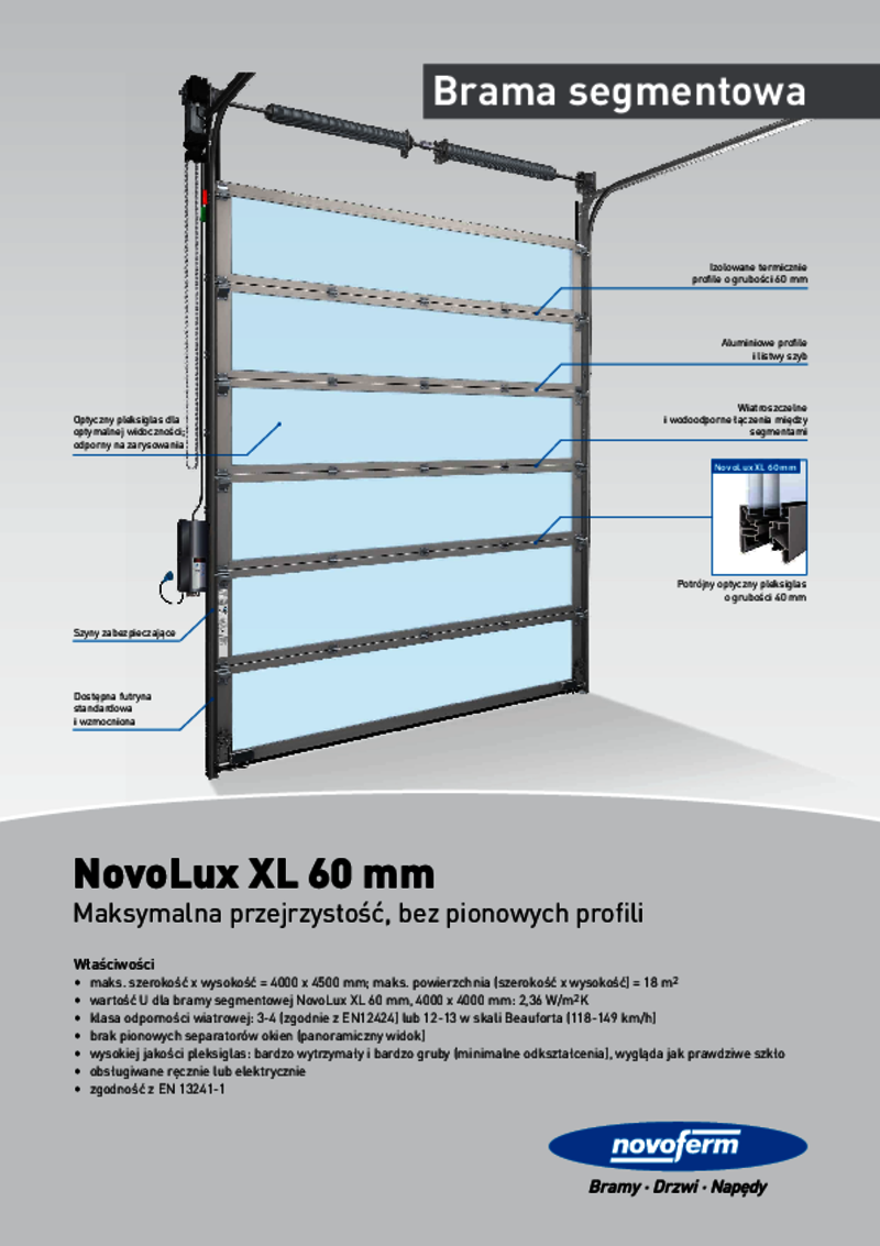 Brama NovoLux XL jest dostępna w maksymalnej szerokości 4000 mm i maksymalnej wysokości 4500 mm. Brama NovoLux XL sprawdza się szczególnie w środowiskach, w których ważny jest atrakcyjny wygląd budynku, a także światło i widoczność w hali. Zastosowany materiał "Plexiglas Optical" charakteryzuje się tym, że wygląda jak prawdziwe szkło, a jednocześnie zapewnia bezpieczeństwo plastiku. Szyby Plexiglas Optical są dostępne jako szyby podwójne o grubości pakietu 20 mm i szyby potrójne o grubości pakietu 40 mm.