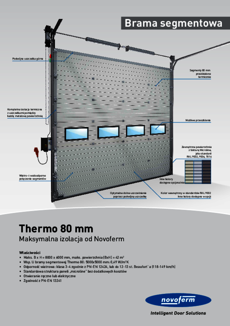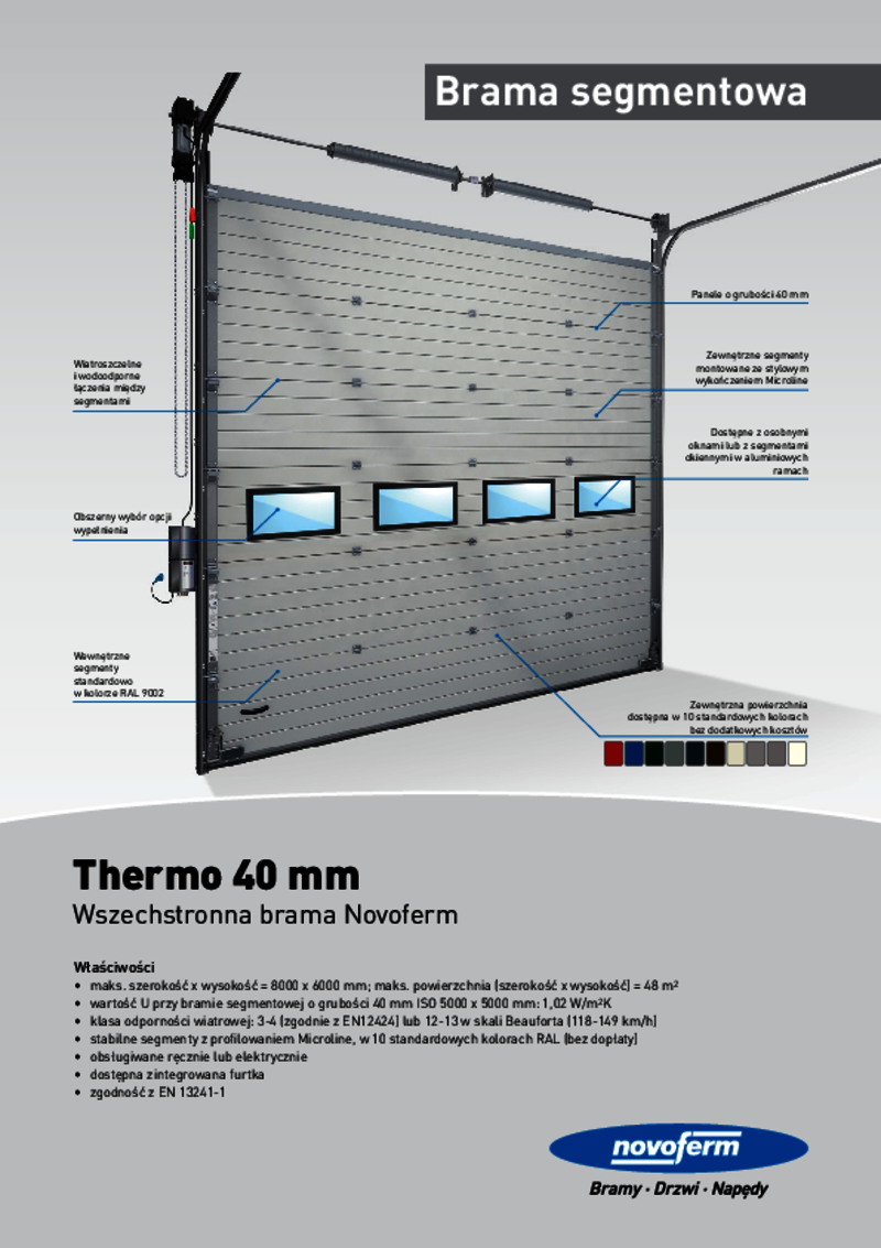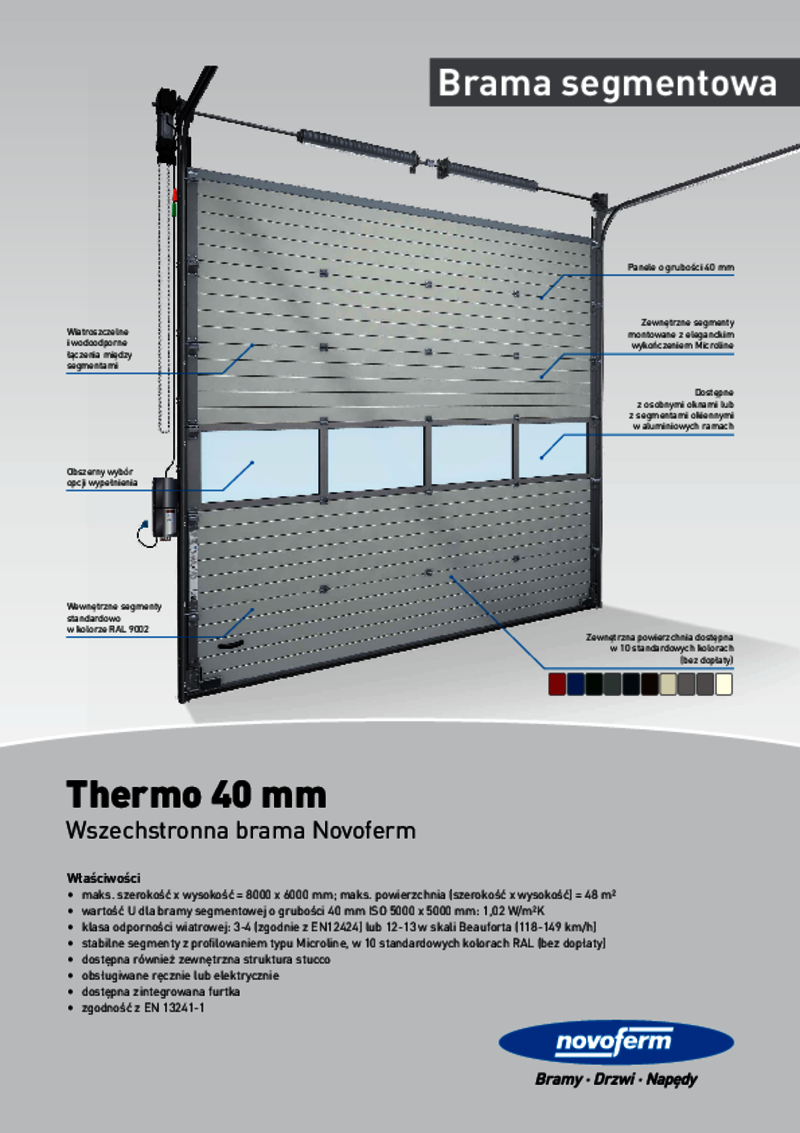Brama segmentowa Thermo 40 to najlepiej sprzedająca się przemysłowa brama segmentowa Novoferm. Brama łączy w sobie doskonałe właściwości izolacji termicznej i akustycznej z mikroprofilowanymi panelami o nowoczesnym wyglądzie. Opcje projektowania i konfiguracji są nieograniczone, co oznacza, że bramę można zawsze idealnie skonfigurować do każdej sytuacji.