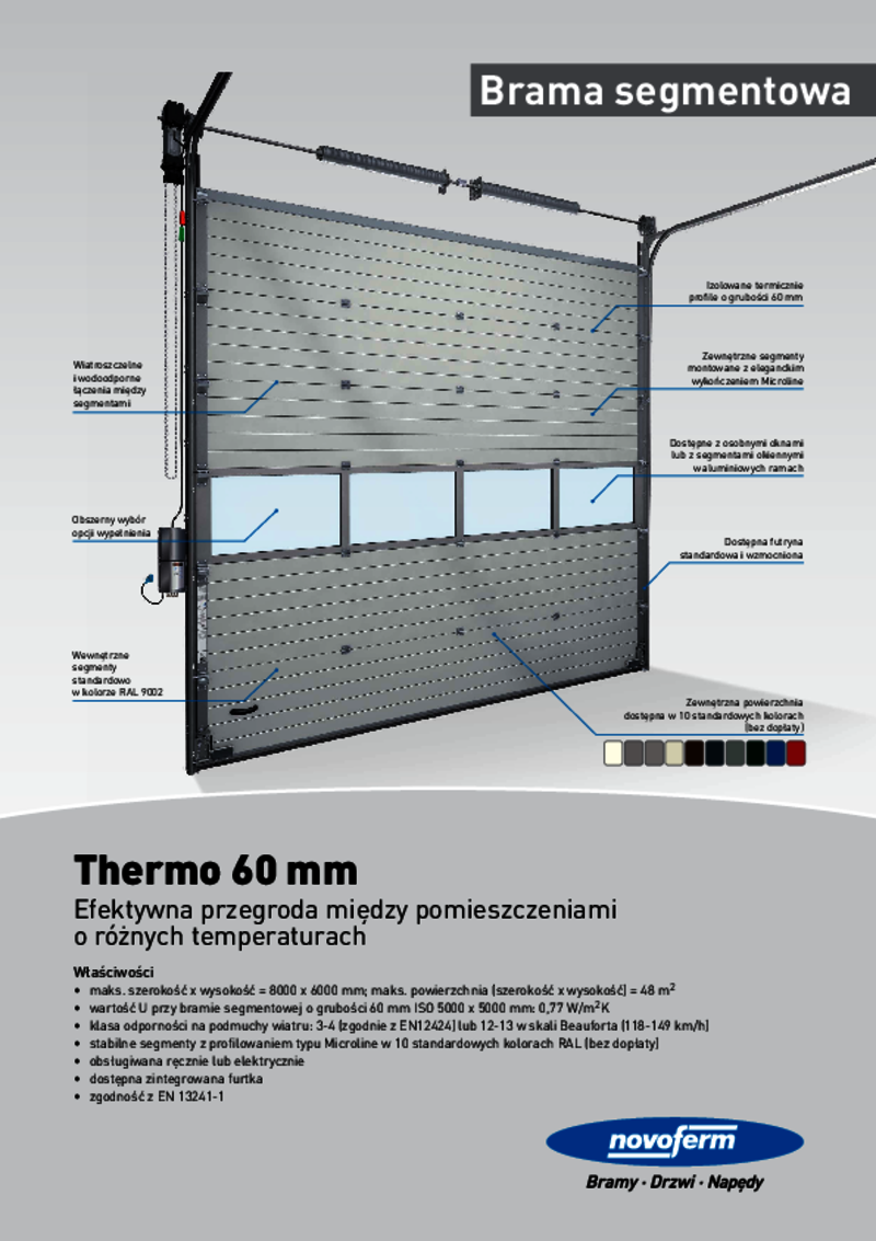 Panele bram segmentowych Thermo 60 są produkowane zgodnie z tzw. zasadą "sandwich". Sztywna pianka poliuretanowa jest umieszczana pomiędzy dwoma arkuszami blachy stalowej i łączona z ocynkowaną blachą stalową po obu stronach. W przypadku specjalnych wymagań kolorystycznych, blacha stalowa może zostać pokryta farbą akrylową w wybranym kolorze z palety RAL.