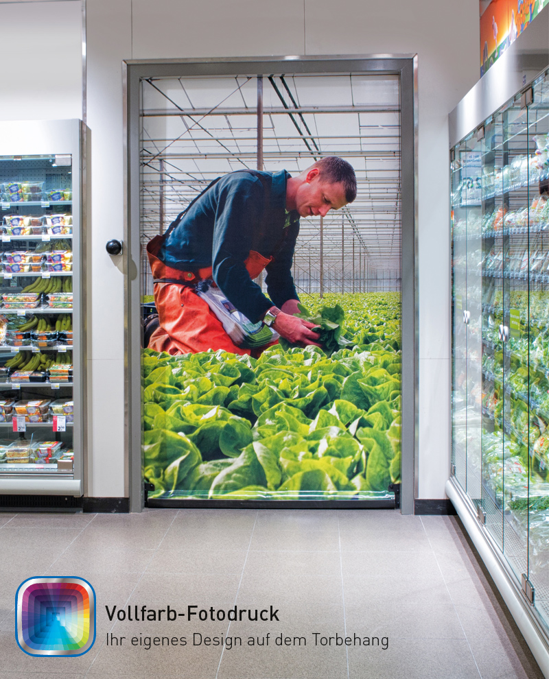 Jednoczęściowa kurtyna bramy może być w razie potrzeby zadrukowana. W ten sposób zamknięte przejście można przekształcić w atrakcyjny element przyciągający wzrok. To wystarczający powód, dla którego bramy Novoferm SpeedRollers są od wielu lat standardem w wielu renomowanych sieciach supermarketów!