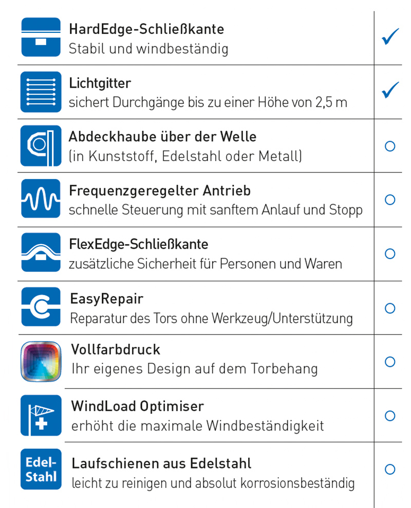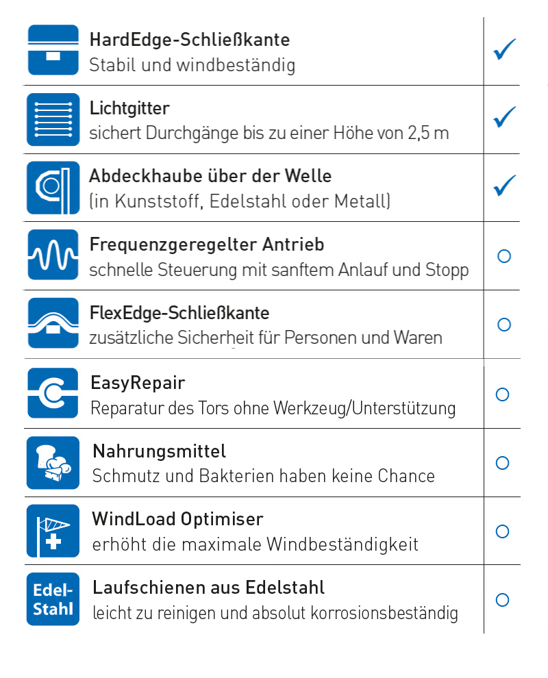 Idealnie nadaje się do codziennego ruchu osób i lekkich towarów. Jednoczęściowa kurtyna bramy pracuje niezwykle cicho i może być dostosowana do indywidualnych potrzeb.