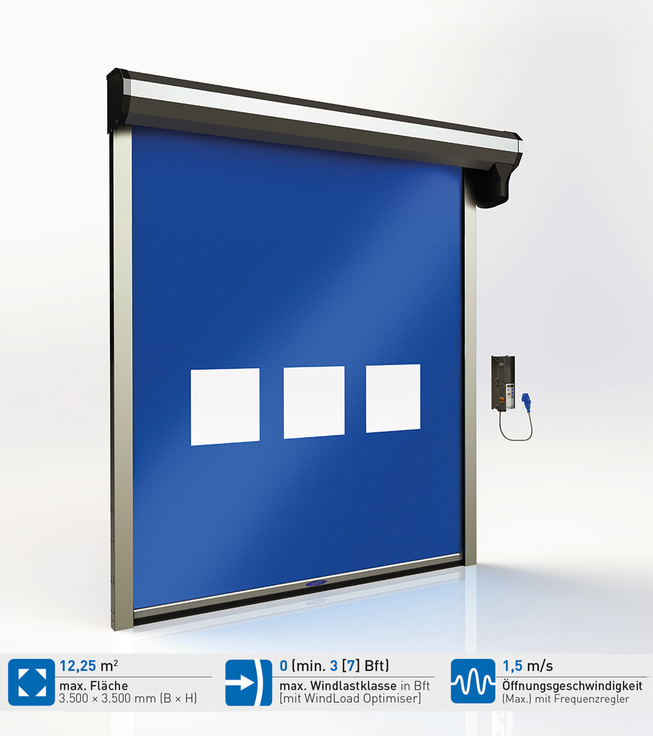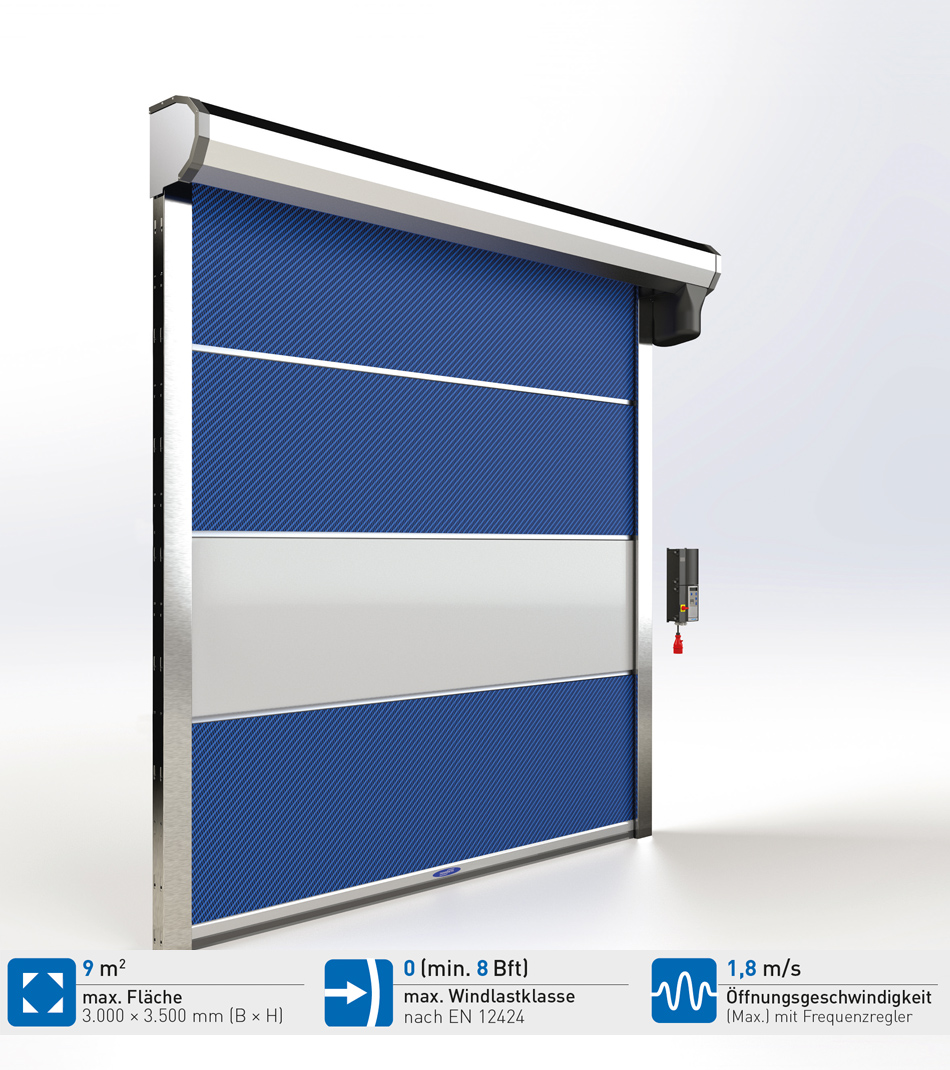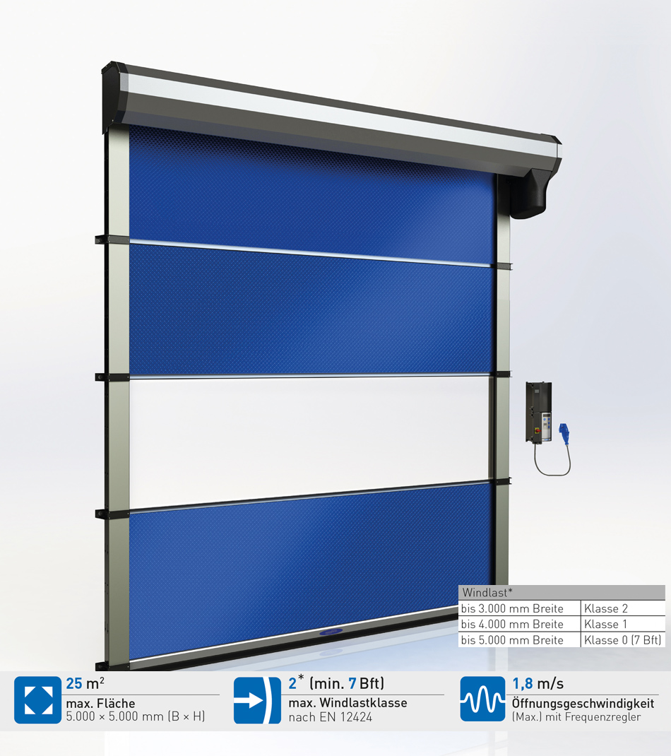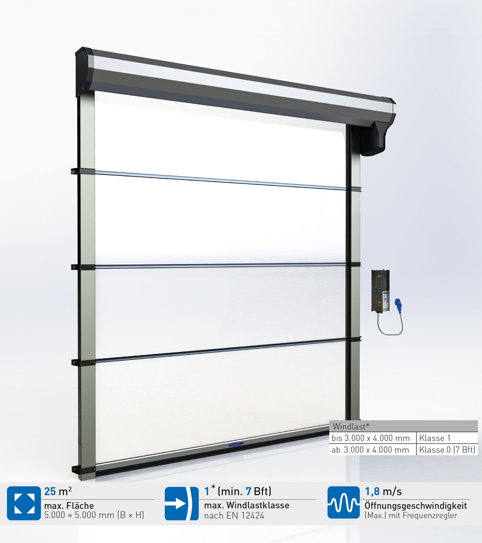 Idealnie nadaje się do szybkiego przemieszczania osób i lekkich towarów. Ta innowacyjna brama jest wszechstronna i nadaje się do otworów o powierzchni do 12,25 m2. Jednoczęściowa kurtyna bramy pracuje niezwykle cicho i może być dostosowana do indywidualnych potrzeb. Wysoka prędkość przesuwu sprawia, że brama ta jest szczególnie odpowiednia do często używanych przejść. Obsługa za pomocą linki lub czujnika ruchu umożliwia szczególnie szybkie i wygodne przejście.