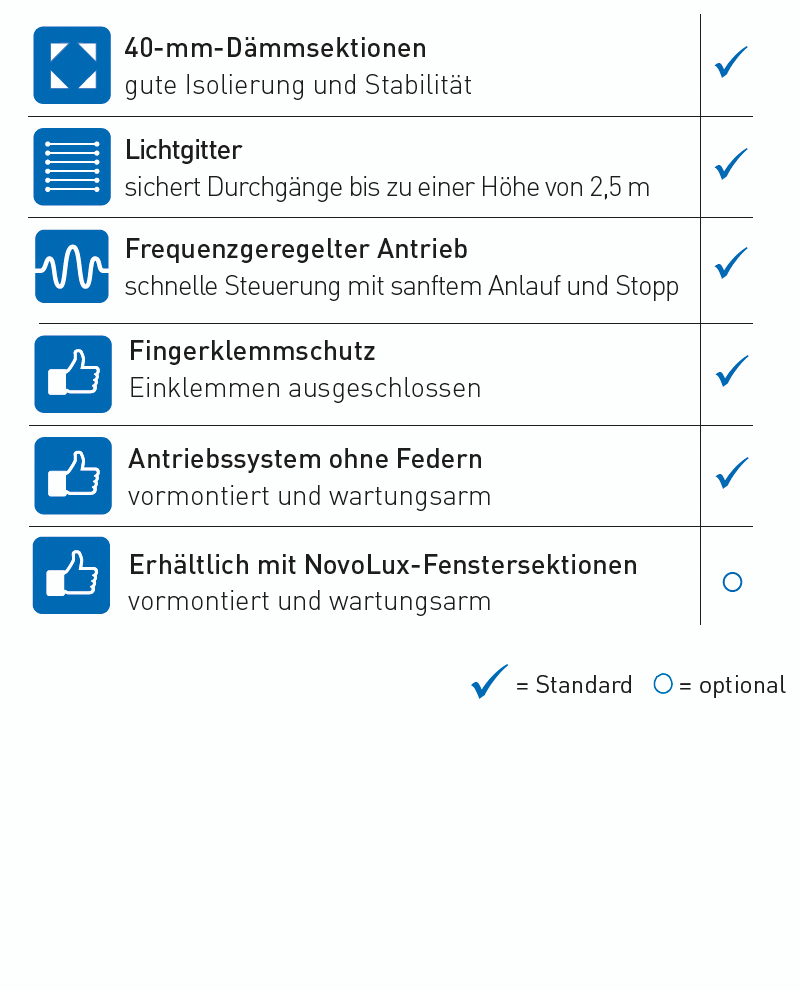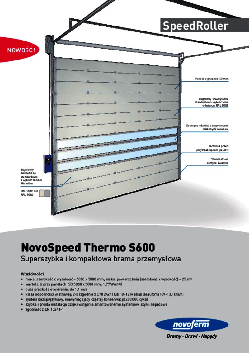 CZĘSTO UŻYWANE WNĘTRZA są często wyposażone w dwa różne typy bram, a mianowicie bramę segmentową do użytku nocnego i bramę szybkobieżną do pracy w ciągu dnia. Nowa brama NovoSpeed Thermo/S600 sprawia, że dodatkowa brama szybkobieżna za bramą segmentową staje się zbędna. Brama NovoSpeed jest szybka, zapewnia niezawodną ochronę przed złodziejami, a także oferuje doskonałą izolację termiczną.