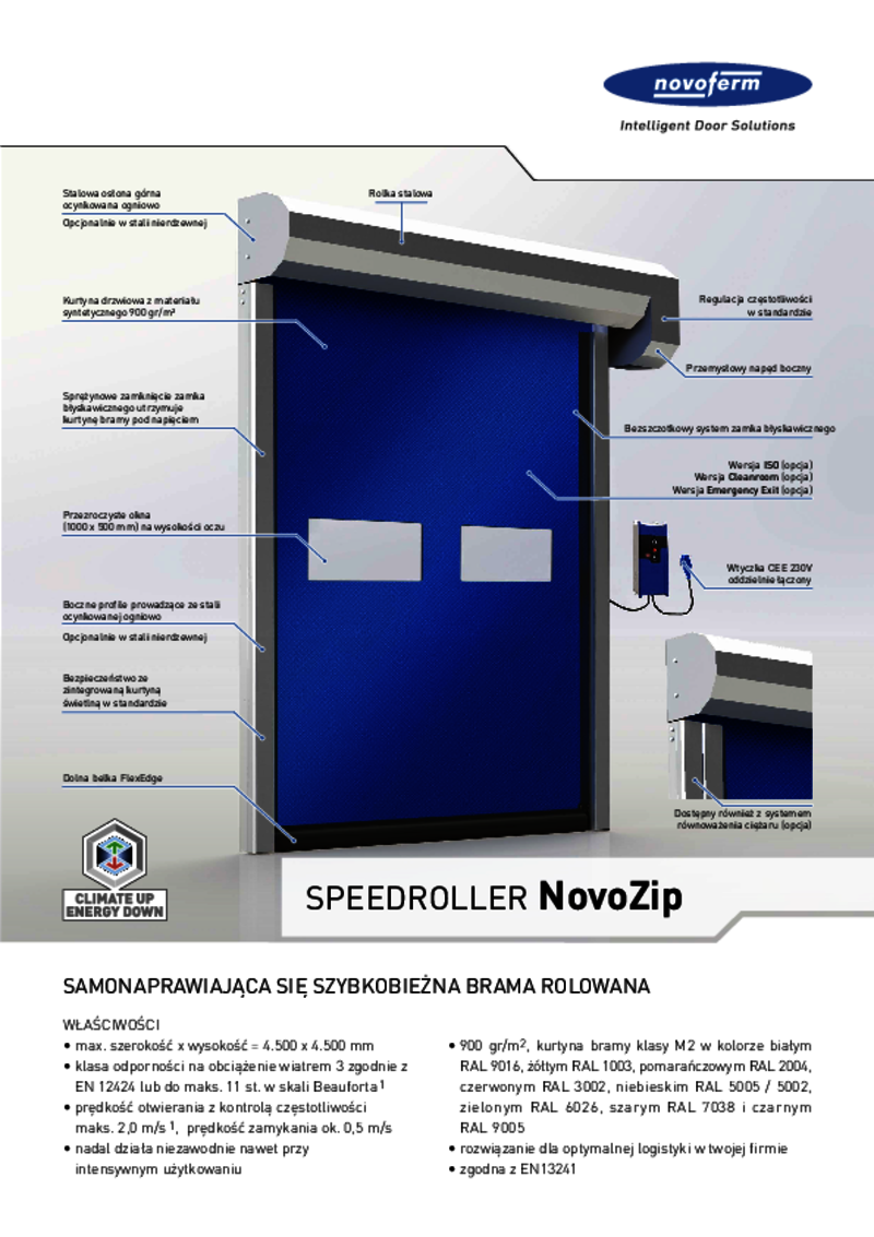 Łączy zalety bramy SpeedRoller i bramy segmentowej w jednej bramie! Dzięki szybkiemu otwieraniu można zaoszczędzić znaczne koszty energii, a jednocześnie zwiększyć przepustowość i zmniejszyć absencję. Dodatkową zaletą bramy NovoSpeed Thermo jest wysoki poziom izolacji termicznej i możliwość szczelnego zamknięcia po zamknięciu.