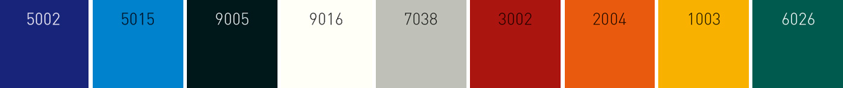 Oprócz standardowych kolorów, skrzydło bramy jest dostępne w dowolnym kolorze z palety RAL (z wyjątkiem kolorów fluorescencyjnych i kolorów drogowych).