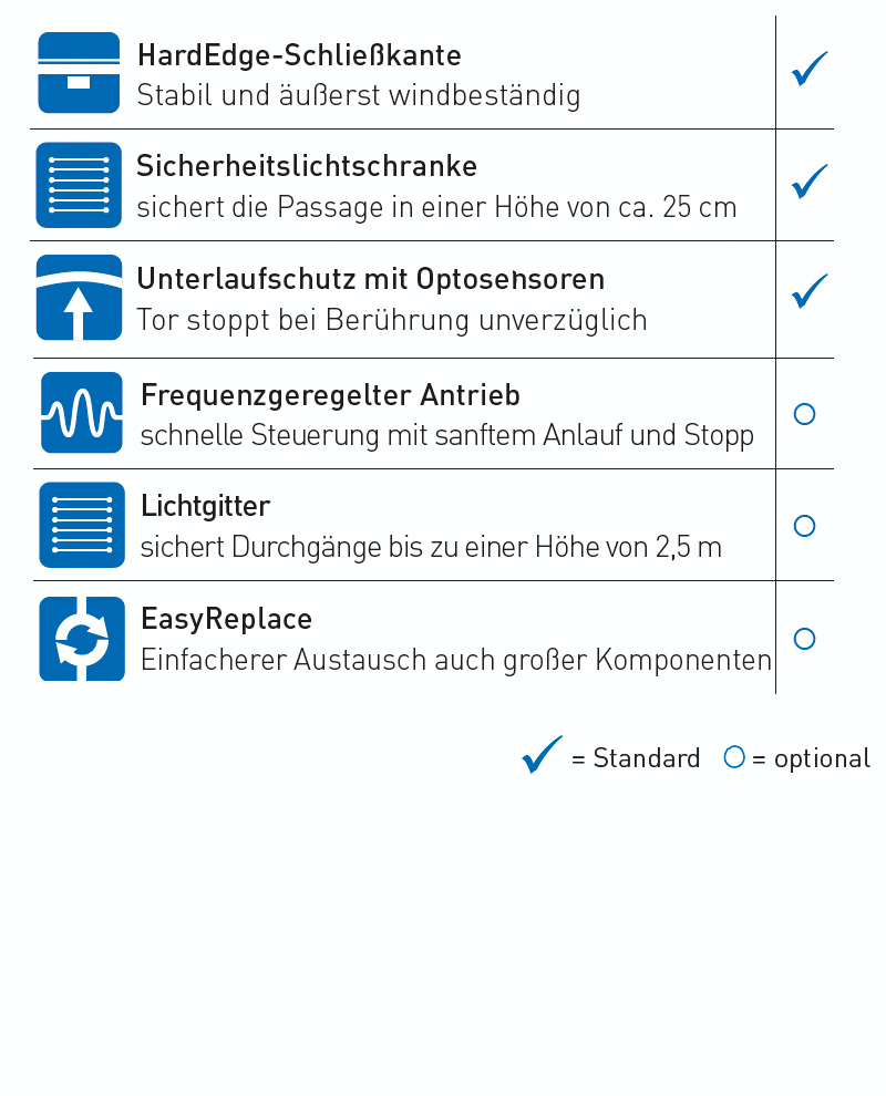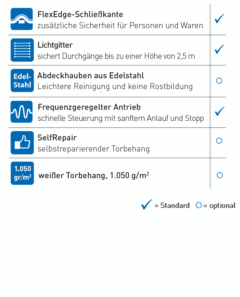- ROBUST: steel guides in the tracks and new end caps on the hinges guide the door curtain
