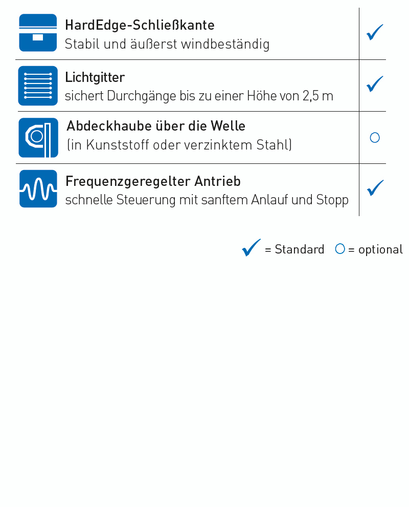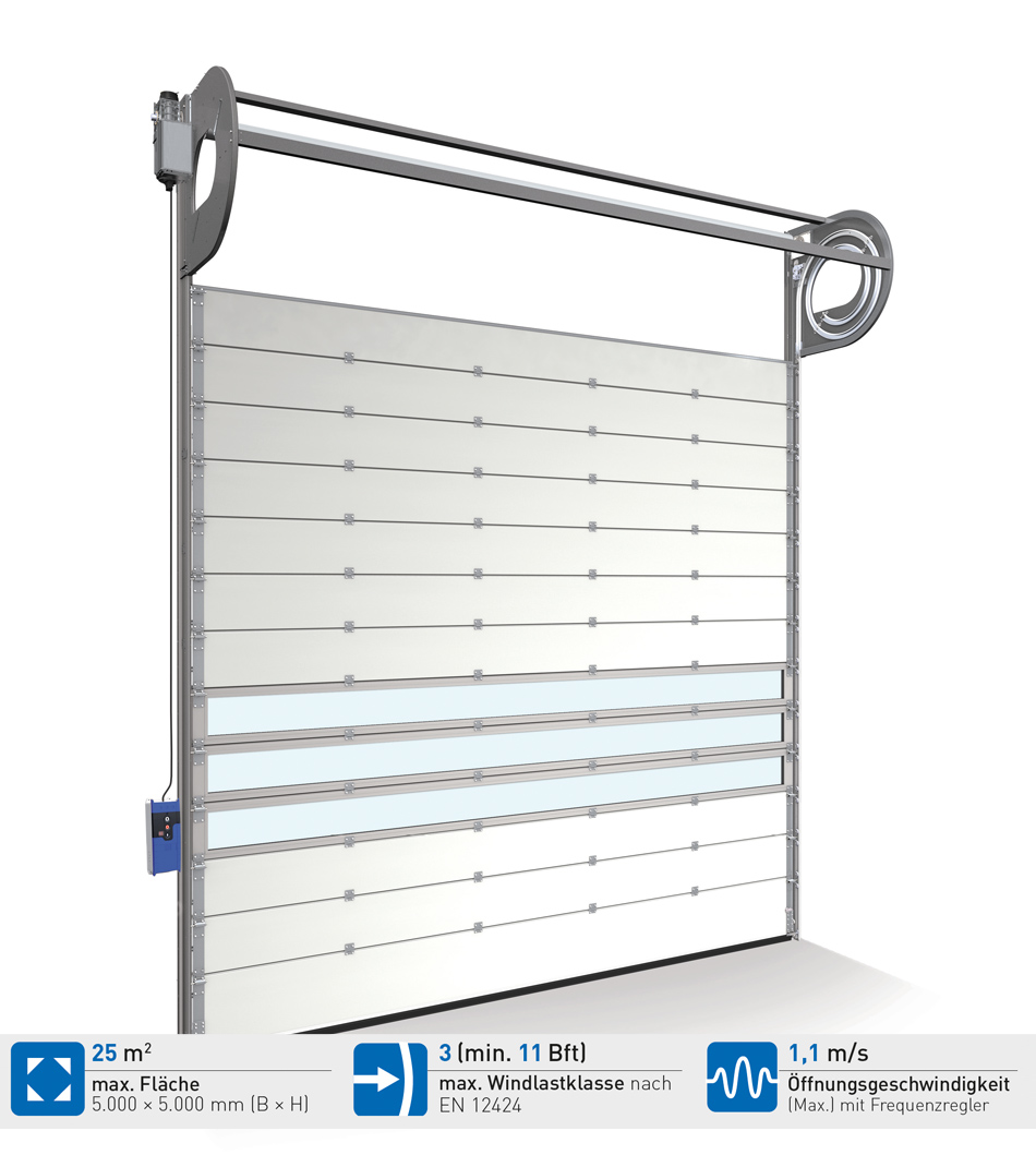 Szybkie otwieranie umożliwia znaczną oszczędność energii, podobnie jak SpeedRoller. Opatentowany system prowadnic jest napędzany przez pomysłowy system łańcuchowo-stalowy.