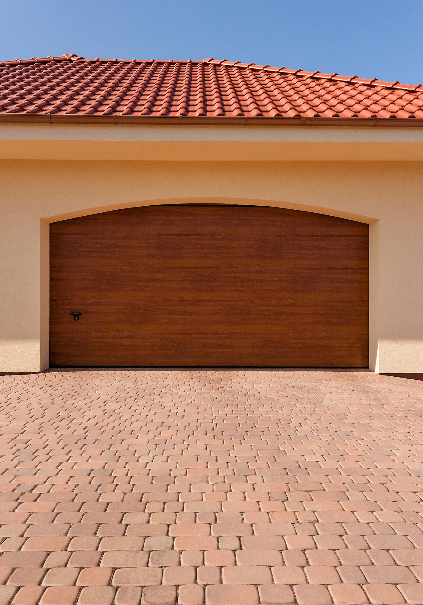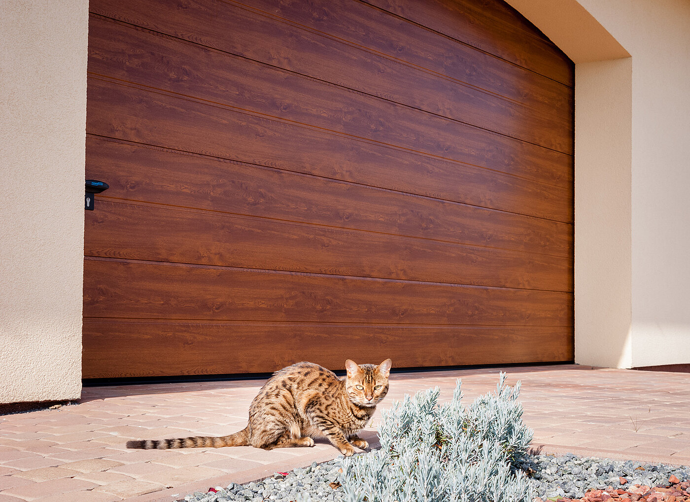 Dom jednorodzinny, Brama garażowa segmentowa, Typ iso 45, Okleina złoty dąb, Przetłoczenia szerokie,