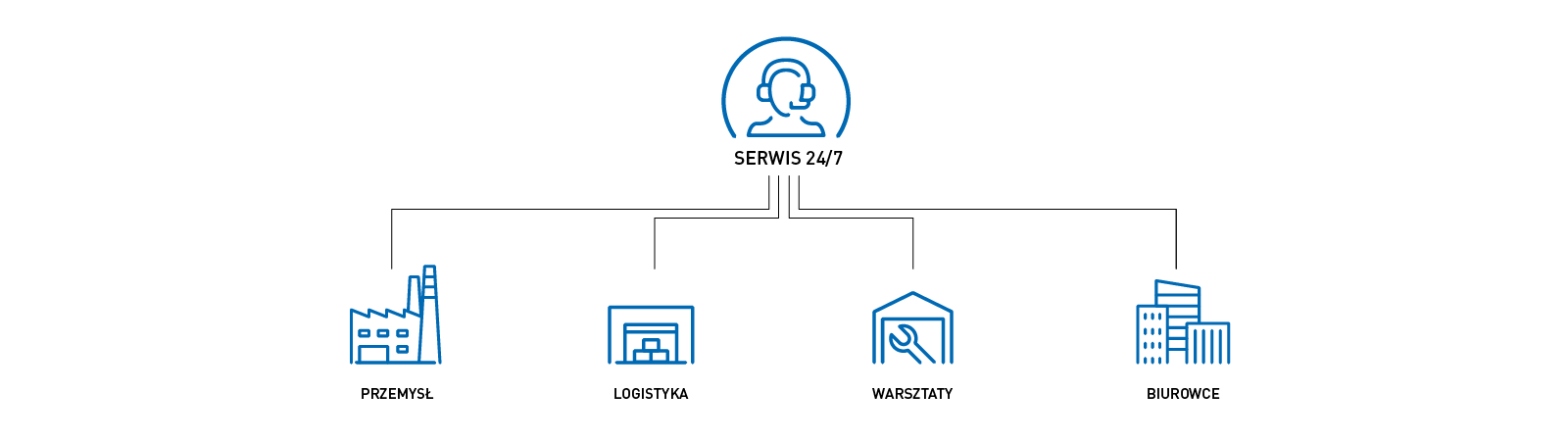 Serwis składa się z mobilnych techników i jest oparty na systemie zarządzania zgłoszeniami.