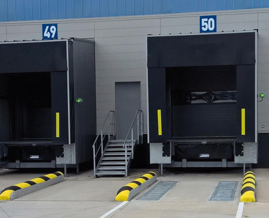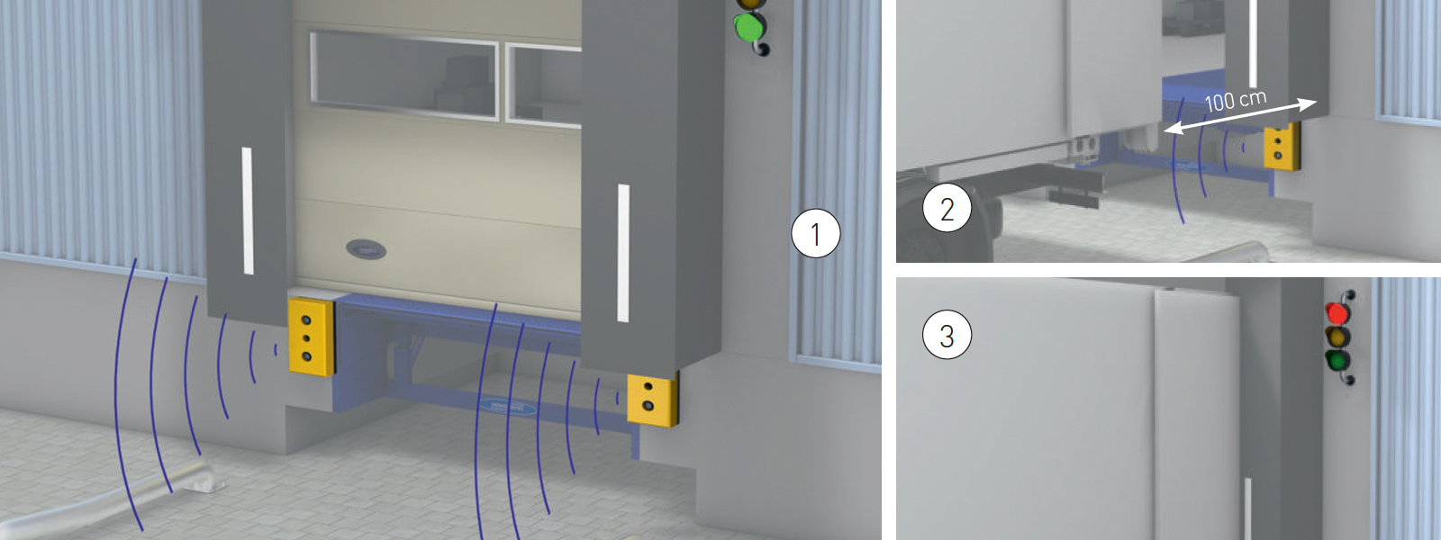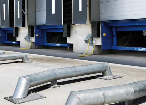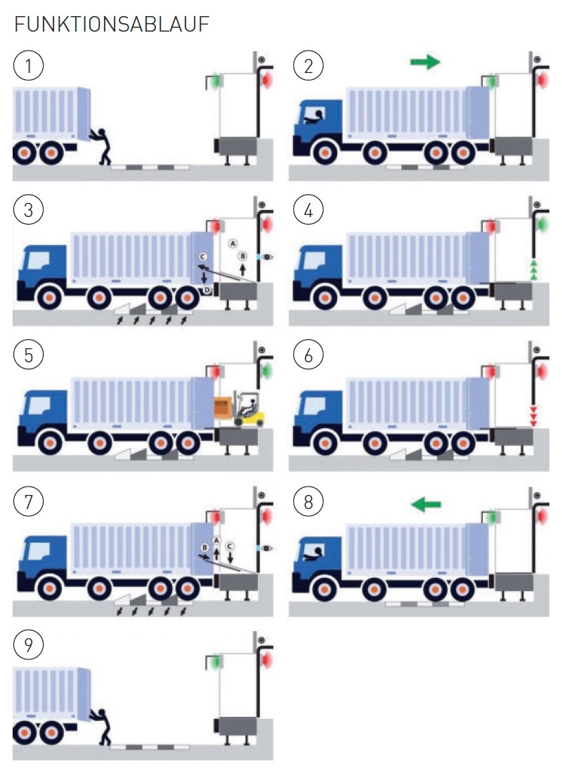 Dlatego stosuje się elektroniczne kliny pod koła połączone z bramą i pomostem załadunkowym. Pomost załadunkowy może być obsługiwany