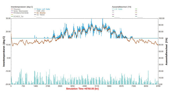 Modele termiczne budynku i przepływu powietrza są generowane w realistycznych warunkach poprzez połączenie wypróbowanych i przetestowanych programów TRNSYS i TRNFLOW. Badanie weryfikuje zachowanie termiczne hal logistycznych i efektywność energetyczną hermetyzacji mostów ładunkowych.