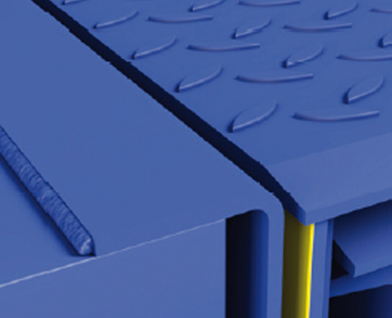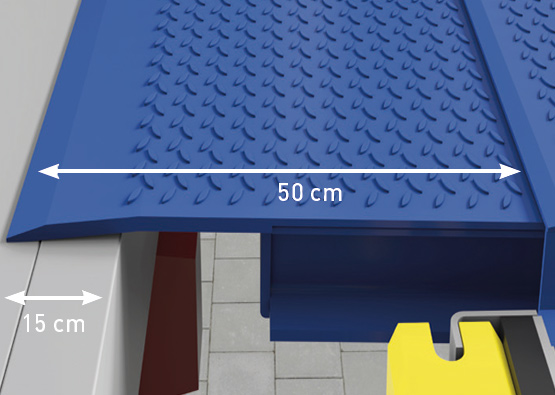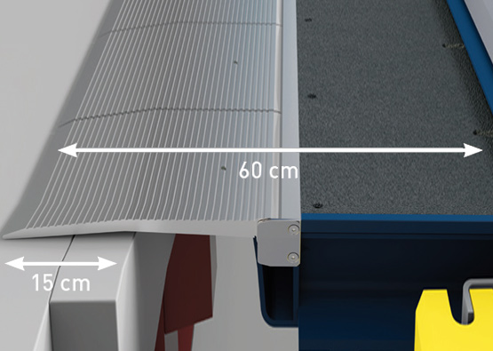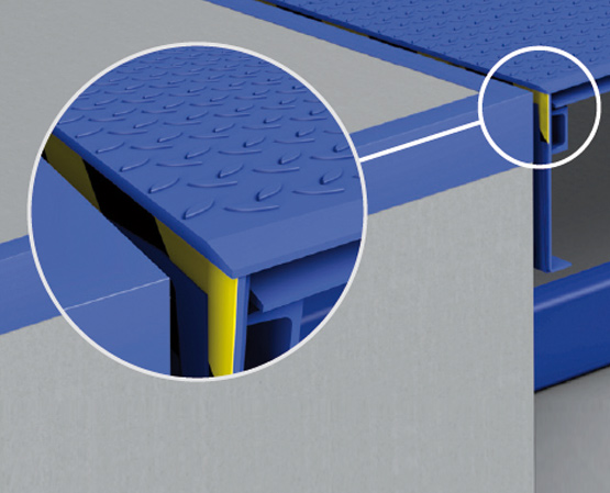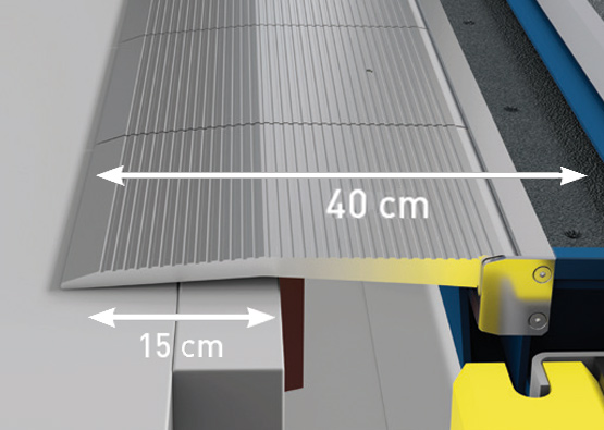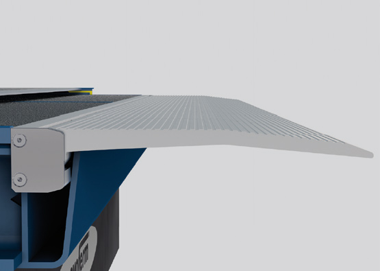 Aluminiowa warga wysuwna - płynne przejście z ciężarówki na rampę przeładunkową. Aluminiowe segmenty o wysokiej wytrzymałości umożliwiają płynniejsze przejście wózka z mostka na naczepę. Chroni to transportowane towary i wózek widłowy, ale przede wszystkim jest bardziej ergonomiczne dla kierowcy wózka widłowego, a tym samym mniej obciąża jego plecy. Ponadto poziom hałasu jest znacznie niższy. Dłuższa wolna powierzchnia podparcia aluminiowych segmentów zwiększa bezpieczeństwo i zmniejsza ryzyko upadku wózka.
