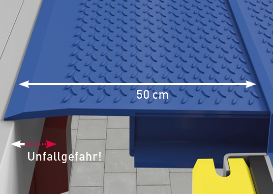 iQ-Slide - inteligentna wysuwna warga podąża za ciężarówką. iQ-Slide to opatentowane rozwiązanie, które automatycznie przesuwa wargę mostka ładunkowego, a tym samym podąża za ciężarówką. Zapobiega to ześlizgiwaniu się wargi z ciężarówki. Jeśli warga wysuwna pokona maksymalną odległość i nie jest już możliwe podążanie za ciężarówką, rozlega się sygnał ostrzegawczy, a dioda LED na jednostce sterującej wskazuje, że funkcja nie jest już aktywna.
