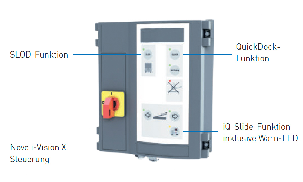 Pomost przeładunkowy jest obsługiwany za pomocą dostarczonej jednostki sterującej Novo i-Vision X. Oprócz najnowszej technologii przyjaznej dla środowiska, jednostka sterująca posiada unikalne funkcje, takie jak Funkcja oszczędzania energii, która prowadzi do ponad 70% niższego zużycia energii